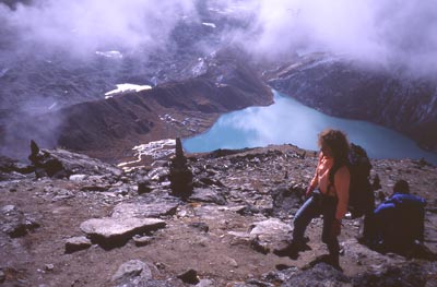 J9 : 4 octobre 2003............... Gokyo (4750 m) - Gokyo Peak (5350 m) - Gokyo......A 6 h en allant prendre mon habituel café au lait au milieu de l'équipe de cuisine qui s'affaire à la préparation du petit déjeuner, la masse imposante du Cho Oyu est éclairée par le soleil levant et me fait regretter l'oubli de l'appareil photo. Malgré la présence dans ma photothèque de milliers de photos du Népal qui attendent un hypothétique classement il y à encore des images uniques à sauver des oubliettes de la mémoire comme ce crépuscule d'hier soir sur le lac quand le turquoise vire au gris que le "numérique" aurai pu traduire avec brio Il faut dire que cette nouvelle technique renouvelle et enrichit cette ancienne passion. Ce matin Marie Christine se sent très mal : nausée, vomissements et dème facial, elle arrive en pleurs au petit déjeuner.Je la rassure, |