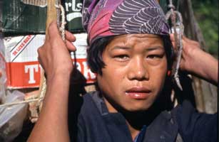 Pont suspendu au-dessus du torrent à Phakding : Les sentiers sont les seules voies de communication