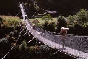 Pont suspendu au-dessus du torrent à Phakding : Les sentiers sont les seules voies de communication