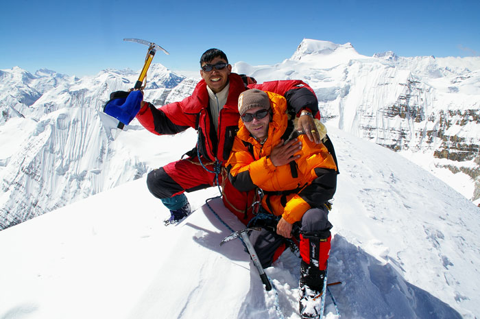 Réveil pénible - surtout pour Alain qui n'est pas du matin - à 4h. Le ciel est pur comme chaque matin, les nuages montent vers midi et il neigeote de 14h à 18h. Nous sommes comme des coqs en pâte, nos sherpas s'occupent de préparer le petit déjeuner. Une soupe de pâtes au petit matin, inhabituel, mais efficace pour ce qui nous attend. Nous sommes en marche à 5h45. D'expérience, il faut presque deux heures entre le réveil et le départ d'un camp d'altitude. Déjeuner, donc faire fondre de la neige, s'habiller, contorsions dans la tente, sortir par -15, mettre le baudrier et les crampons sans attraper l'onglée. Vous aurez compris que ce n'est pas le meilleur moment de la course. Seul Galzen nous accompagne, Tenzing n'ayant ni chaussures ni crampons. Dès le départ, je regrette l'absence des bâtons, les pentes sont peu raides et la neige ne porte pas, la montée au col est interminable. Nous nous relayons à la trace dans une neige croûtée, puis poudreuse dans laquelle nous enfonçons de 15 à 30 centimètres, ce qui rend la montée très physique autour des 6000 m. Mais en adoptant un rythme himalayen, c'est supportable, l'approche du sommet et le spectacle qui nous entoure nous aide à endurer patiemment l'effort de chaque pas. Si bien que nous touchons le sommet à 9h30 après 3h45 d'effort. Nous sommes très émus, Alain et moi et regardant l'Himlung juste en face on pense à nos compagnons disparus. Ce retour heureux à l'Himalaya, nous en avions besoin l'un et l'autre. La descente sur nos traces nous conduit au camp où Tenzing nous mitonne pommes de terre et faillots, façon Saribung menu unique, mais tellement reconstituant. Nous sommes dans cet état d'après course où tout se fait lentement, une bonne fatigue, une douce ivresse. Reprenant nos traces de la veille, nous sommes en deux heures au camp du lac où l'équipe de cuisine nous traite comme des princes.